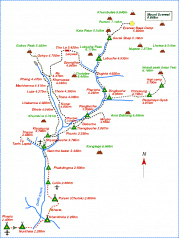 The beautiful Imja Khola Valley offers up marvellous views of fabulous peaks and glaciers, as does the highest camp of the trek, at Gorak Shep, from where begins the ascent of Kala Patthar (5545m). At last there will be a sighting of the familiar black, rocky, triangle shape of the south-west face of Everest, with a day visit to the focus of this trek – Everest Base Camp. After this undeniably demanding visit to EBC, a more serene activity is a visit to the celebrated Thyangboche Monastery, the region’s most important centre of Buddhism, but more than worth the effort if just because of its fame.